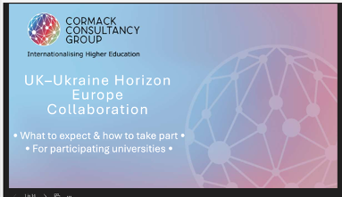 Кафедра менеджменту, маркетингу та підприємництва приєдналась до цікавої спільної ініціативи, в рамках постійної підтримки Великої Британії українських університетів через ініціативу Twinning. Консалтингова група Cormack, за підтримки Міністерства закордонних справ, у справах Співдружності та розвитку Великої Британії (FCDO), Міністерства освіти і науки України, а також Офісу програми «Горизонт Європа» в Україні, запустила спеціальну ініціативу щодо зміцнення співпраці між Україною та Великою Британією в рамках проектів програми «Горизонт Європа».